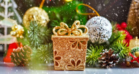Winter New Year decor, decorations on the Christmas tree, blur.