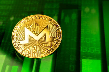 Growth of Monero crypto currency, green stock chart graphs background, golden coin closeup