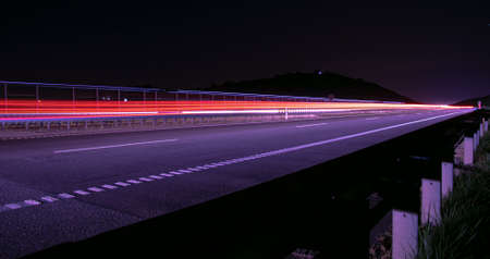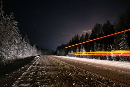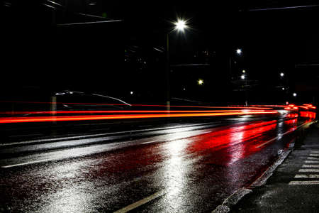 Lights of cars at night. Street lights. Night city. Long-exposure photograph night road. Colored bands of light on the road. Wet road after rain.