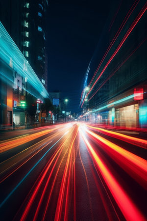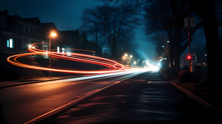 Low angle street view at night with long light trails long exposure created with generative AI technology