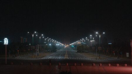Colorful background of night street with defocused light cars and street lamps. Abstract backdrop of bokeh blurred lights at city life. Concept of cityscape backgrounds for design. Copy text space