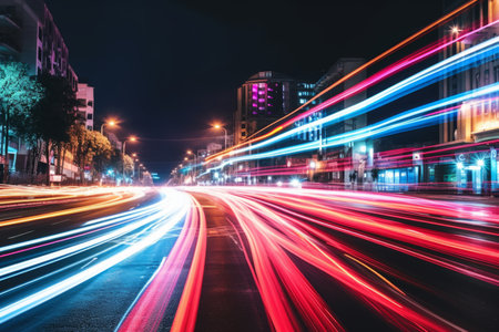 A dynamic view of nighttime city traffic showcasing light trails from vehicles on a busy road. The vibrant colors and motion convey the energy of urban life.