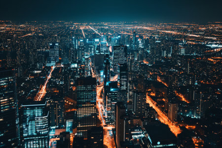 Abstract blured bokeh city night lights. Urban night light bubble bokeh defocused background. City lights, financial district skyscrapers.