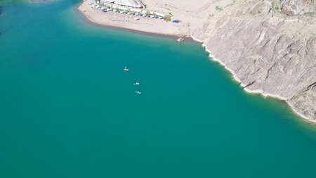 Aerial view from above on azure sea and volcanic rocky shores. Small waves on water surface in motion blur. Nature summer ocean sea beach background. Nobody. Holiday, vacation and travel concept