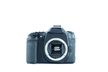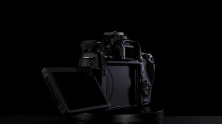 Close-up side view of a black digital mirrorless camera, blank LCD screen and control buttons, isolated on white background with full depth of field