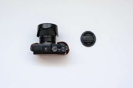 Kuala Lumpur, Malaysia - June 3,2021 : Sony compact or mirrorless camera closeup on black background. Selective focus and crop fragment