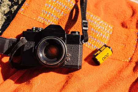 Old unrecognizable black analog photo camera on an orange background with a 35mm reel film next to it. On top of some sea rocks on a sunny day in Spain.