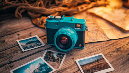 Turquoise Adventure. Professional mirrorless camera in vibrant turquoise color displayed with travel photographs on rustic wooden surface in warm lighting.