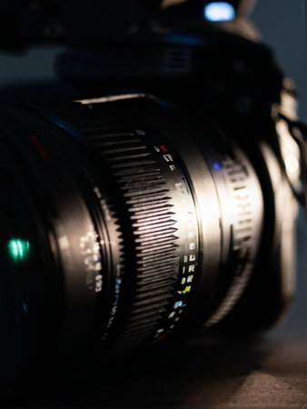 The camera lens showcases vibrant reflections and detailed textures placed on a natural wooden surface. Soft daylight enhances the lenses features offering a glimpse into photography.