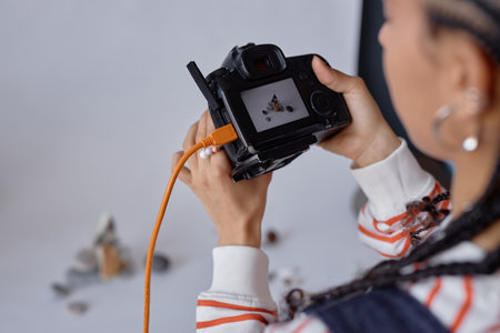 Close up of young Black woman holding professional photo camera and taking product pictures on white set in studio copy space