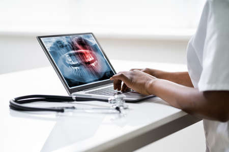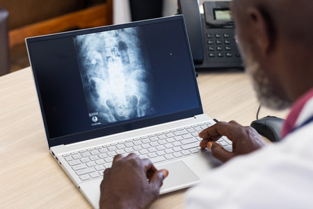 African american male doctor using laptop with radiograph on screen at doctor's office. Hospital, medicine, healthcare and communication.