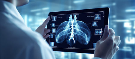 Professional doctor working at his desk: he is checking a patient's lungs x-ray image on a digital tablet