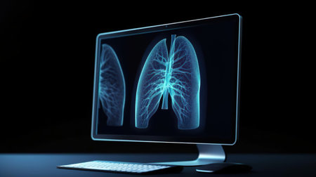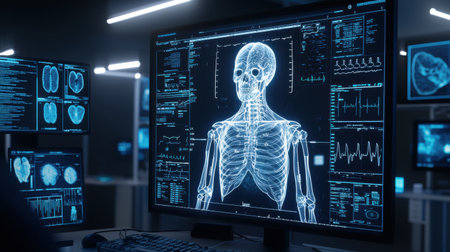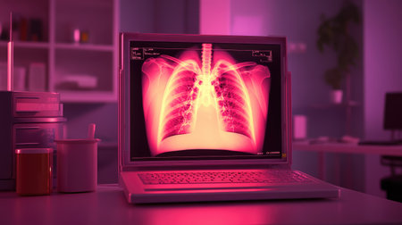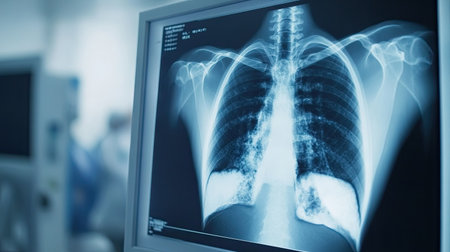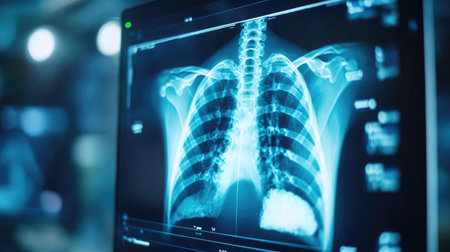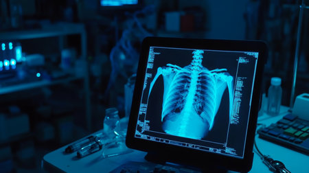A detailed digital display shows an X-ray of a human ribcage and lungs in a medical environment.