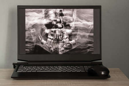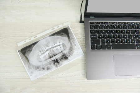 Selective focus. Orthopantomogram of human teeth, panoramic x-ray, next to a laptop with a blank digital screen on the dentist's desktop. Diagnostics. Prevention. Dental treatment. Dental practice