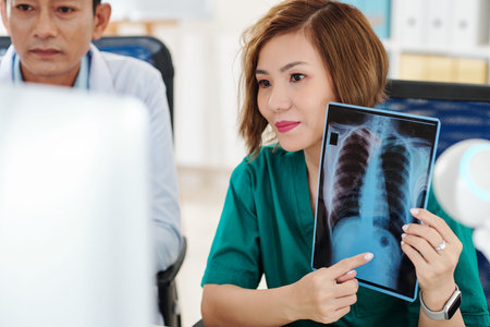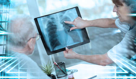 Pulmonologist therapist examining an x-ray of lungs. Health care and medical insurance concept