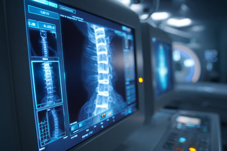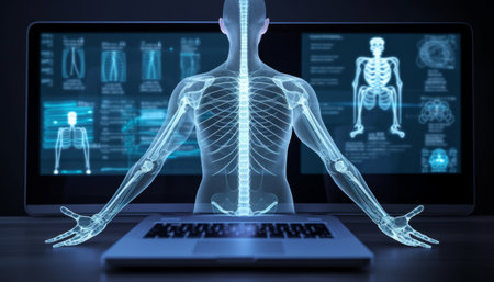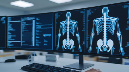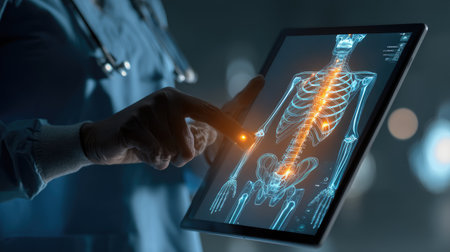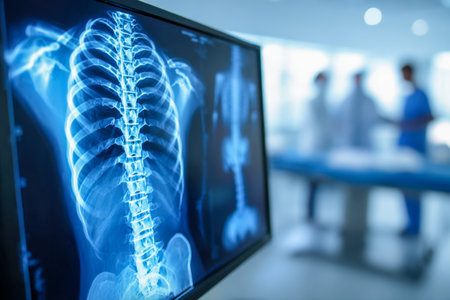 A detailed digital visualization of a spine and ribcage scan against a clinical backdrop, with a team of healthcare professionals analyzing patient data in the distance.