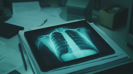Table with phonendoscope, and a X ray image of the lungs with pneumonia on the tablet