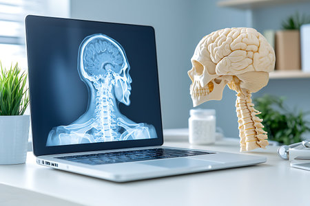 3d computed tomography of the brain with a fracture of the frontal part of the skull after injury on the laptop screens on the table, the skull