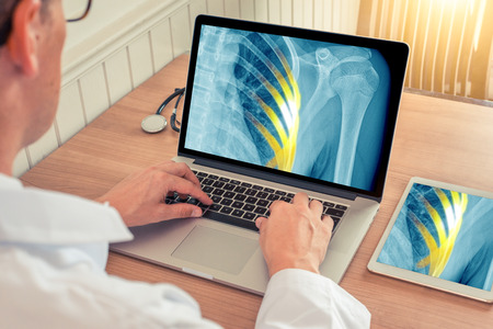 Doctor watching a laptop and digital tablet with x-ray of chest with pain relief in the ribs