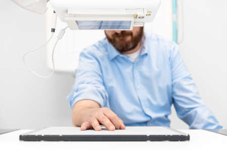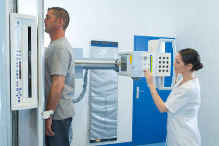 front view of a male radiologist adjusting the X-ray machine in examination rom
