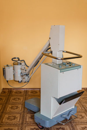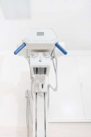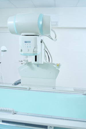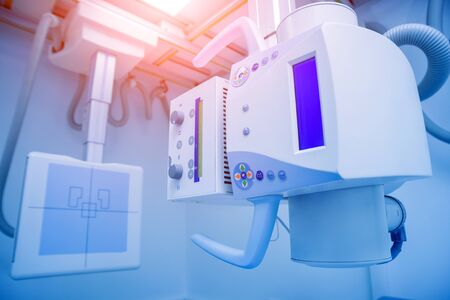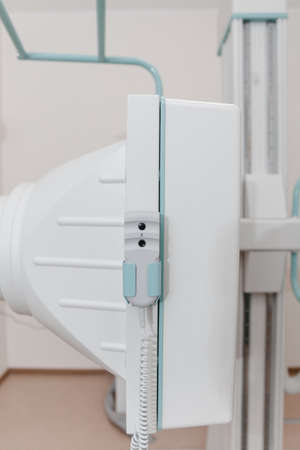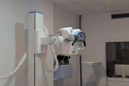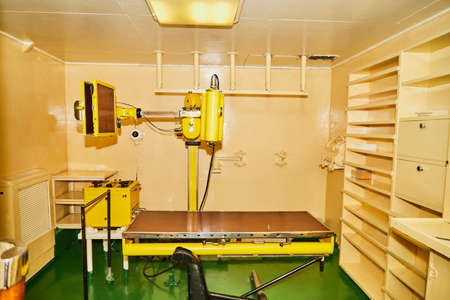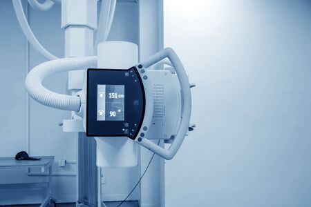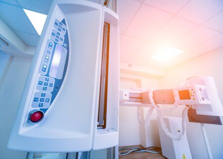 Inside X-ray room. Big professional machine for diagnostic in light accommodation, copy space
