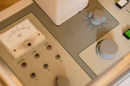 Vintage Medical X-Ray Machine Control Panel with Analog Meters and Dials.
