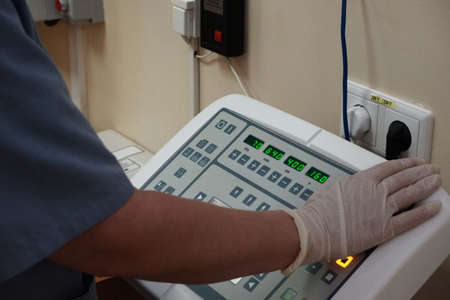 Hospital Radiology Room. Xray fluorography device remote control. Doctor radiologist in gown adjusting the X-ray machine for radiography. Medical equipment. Scanning chest, heart or lungs in clinic