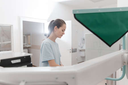 Mature female patient is undergoing thorax radiography in upright position