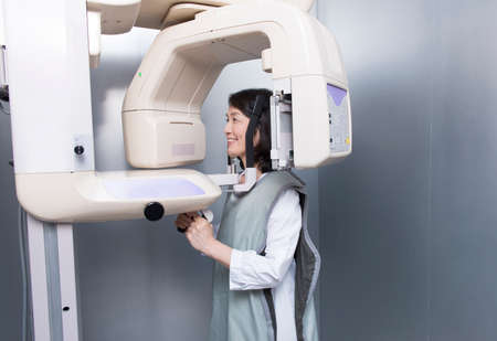 A woman radiologist at the X-ray apparatus is conducting diagnostic images.