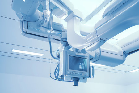 A high-tech imaging machine hangs from the ceiling in a pristine medical room, illuminated by soft blue light, showing its intricate components and high levels of precision engineering.