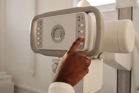 Hand of young African American radiologist pressing button of control panel of roentgen machine before medical examination