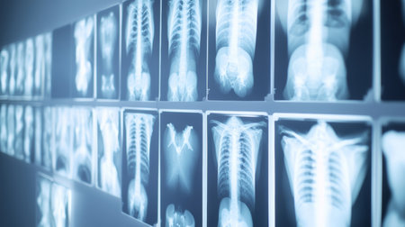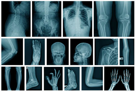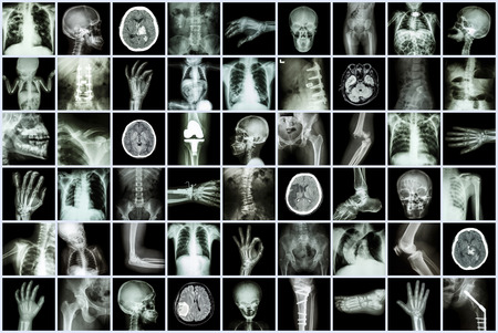 Many radiographs showing bones of different parts of human body are displayed on a light panel, creating an interesting pattern for medical studies and diagnosis
