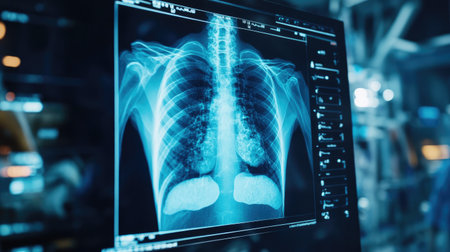 Healthcare worker analyzing X-ray of lungs, medical charts and screens in background