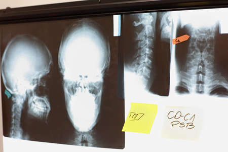 Images of skull and spine with notes at x-ray film viewer. Diagnosis,treatment planning