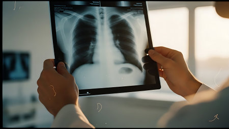 Doctor looking at x-ray image of lungs, lungs and bronchial spine