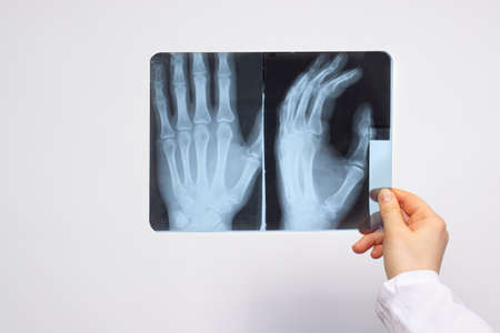 A doctor or radiologist holds an X-ray of a patient with a hand injury. Diagnosis of fractures, fractures of bones and dislocations of the joints of the arm