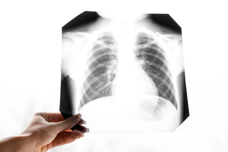 A snapshot of a fluorogram of the lungs in hand, space for text.