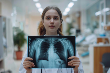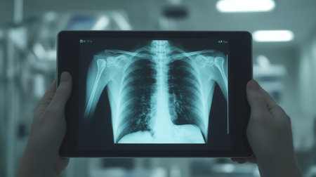 Medical professional displays X-ray of human chest on tablet in hospital setting