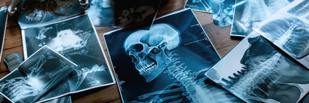 Detailed x-ray images reveal a human skull and brain scans, illustrating medical diagnostics in practice.