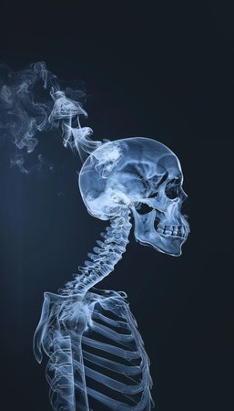 Human skeleton X-ray reveals intricate bone structure, featuring skull, spine, and ribcage, highlighting the complexity of anatomy in a medical examination