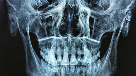 Close-up X-ray Image of a Human Skull with Teeth. Concept of medical imagery, anatomy, head examination, healthcare diagnostics.