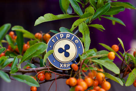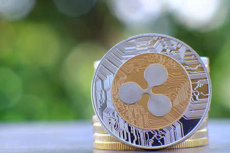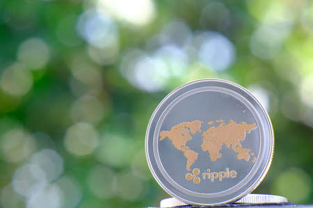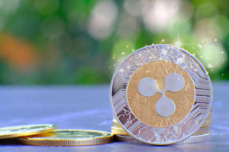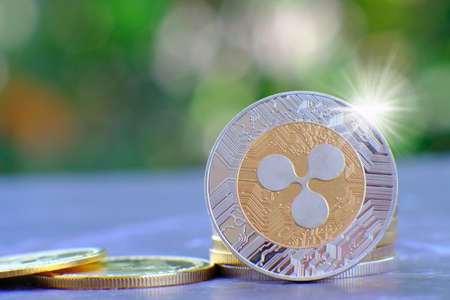 Ripple coin on blurred bokeh background. Cryptocurrency concept.