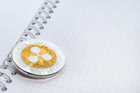 Crypto Coin Ripple on a paper sheet of opened spiral spring notebook.