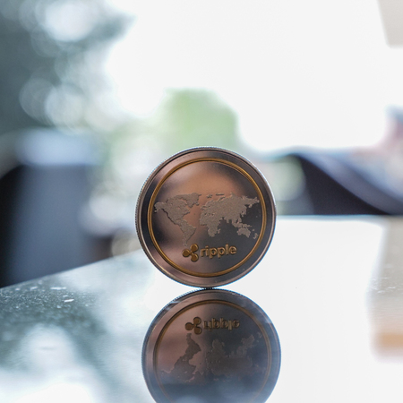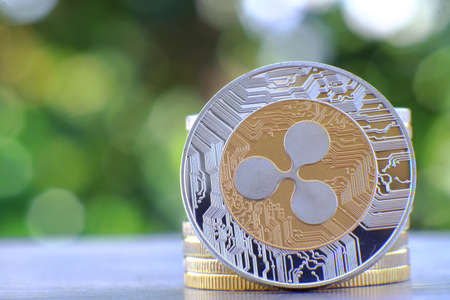 Ripple coin on the table with bokeh background. Cryptocurrency concept.