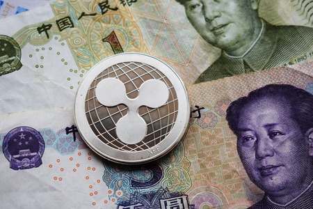 Ripple XRP Coin on Chinese Yuan and US dollar. Close-up.