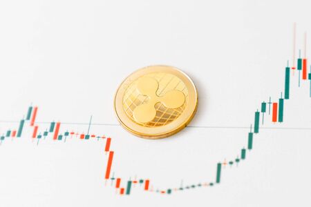 Close up of gold crypto coin ripple xrp on white background concept for trading and buying cryptocurrencies and investing in alternative money analogues