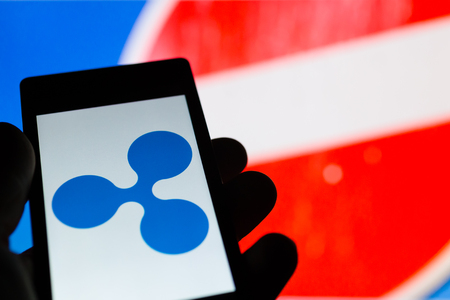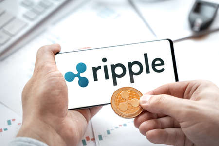 MONTREAL, CANADA - SEPTEMBER 8, 2018: A hand holding XRP Ripple crypto currency coin in a hand over a bitcoin chart on a desktop screen.