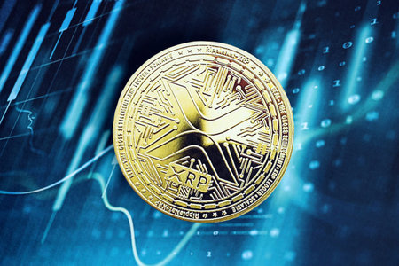 KYIV, UKRAINE - OCTOBER 9, 2025 XRP Ripple cryptocurrency coin sticker on blue candles chart banner. Concept of modern crypto money