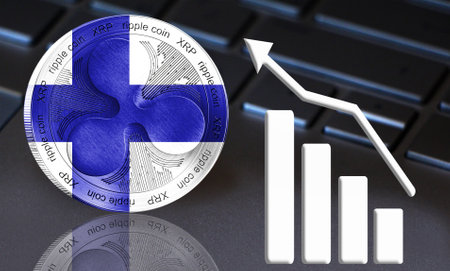 Coin Ripple (XRP) with the flag of Finland depicted on it. In the background a keyboard, shown as a growing graph. New cryptocurrency, business concept.