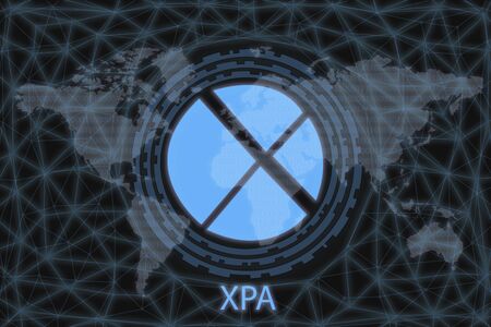 XPA Abstract Cryptocurrency. With a dark background and a world map. Graphic concept for your design.